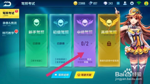 进入训练以后,点击中级驾照进入,考过初级才能考中级,如图。