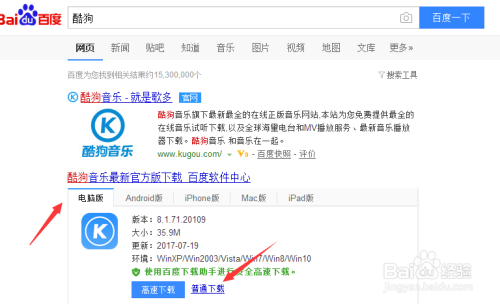 我们以酷狗为例。打开百度,输入酷狗选择电脑版下载。