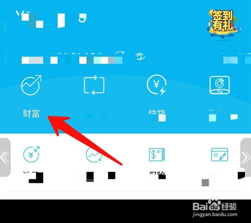 然后再次退回到软件的首页位置,然后点击图示位置中的“财富”图标。