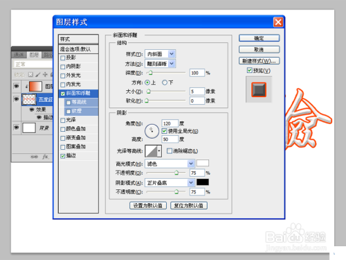 执行图层-创建剪贴蒙版命令,选择图层面板中的文字图层,执行图层-图层样式-斜面和浮雕命令,设置方法为雕刻清晰,高度为50度,点击确定。