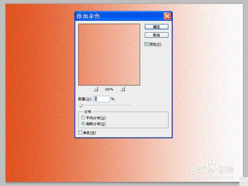 接着按住shift键从左到右进行拖动,执行滤镜-杂色-添加杂色命令,在弹出的对话框中设置数量为5像素,勾选单色和高斯分布,点击确定按钮。
