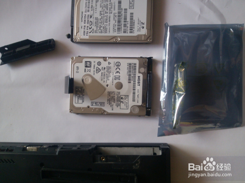 拆开笔记本电脑的硬盘盒,取出坏硬盘。T410的硬盘有黑色的拉带,向外一拉硬盘就出来了。