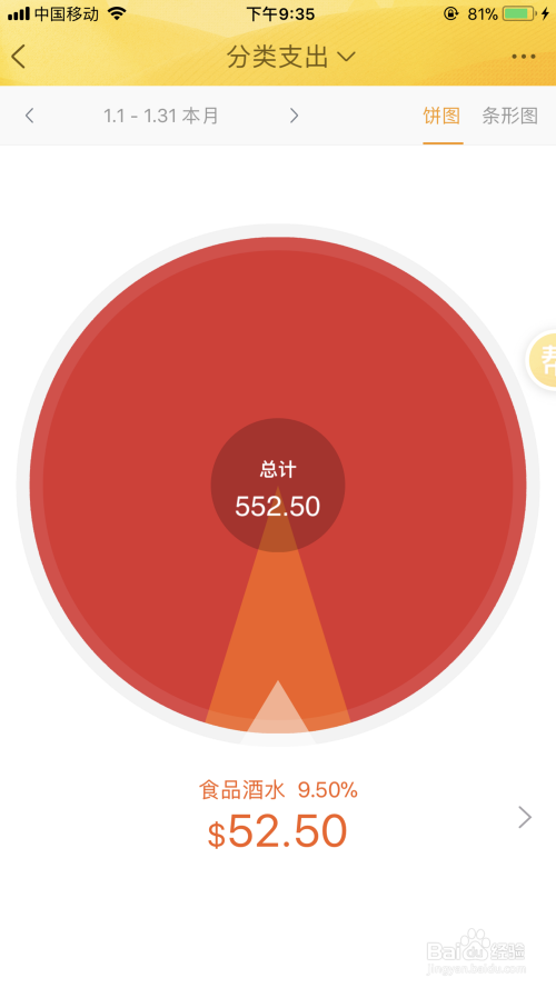 就图表来说也是我最喜欢的一种,一会儿要说到的挖财,是需要通过手指转动才能看到不同的支出比例,步骤多了一步,整体也不直观。网易有钱的支出数目、构成、各自比例很清晰。深红色表示最多,然后依次变淡,这个设计也挺符合国际流行理念,大家都看过类似报表图吧?