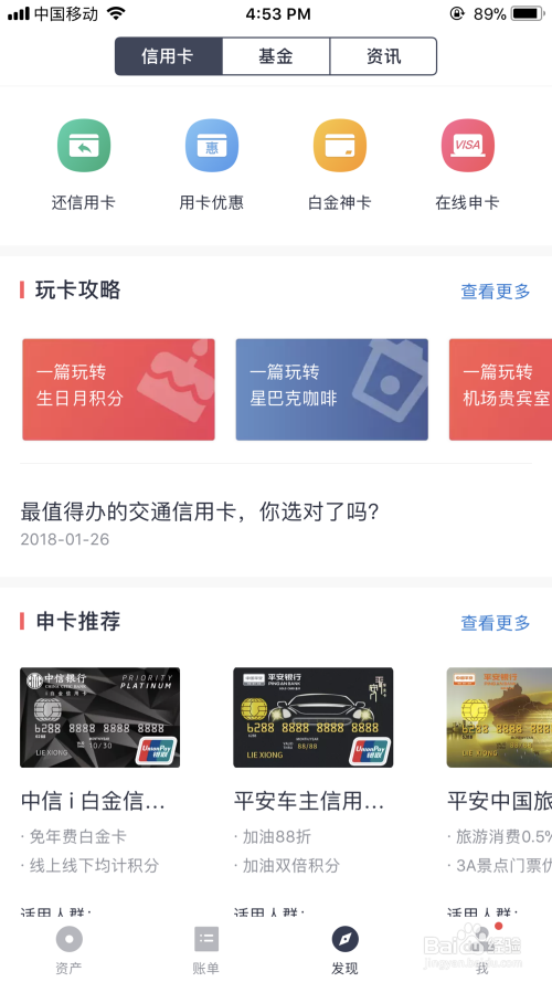 对了,网易有钱把信用卡放在了一个挺突出的位置上。“发现”页面一点开,就是信用卡管理的多种功能,包括信用卡还款、信用卡优惠信息采集、在线申卡、玩卡攻略等。这样挺好的,一是信用卡记账本身就是记账的重要分类,二是引导用户擅用信用卡,更有助于培养用户的正确理财观念。