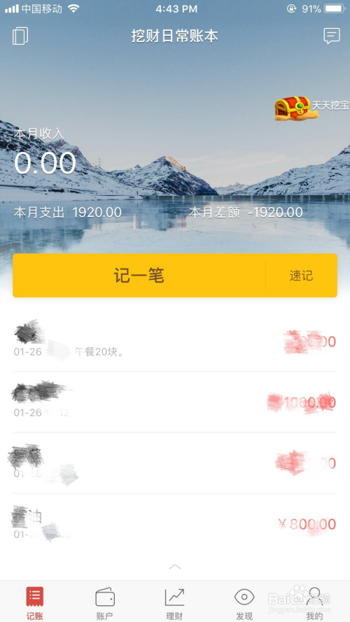 挖财的界面,个人认为还是蛮小清新的。用风景画的形式有利于消解记账的“严肃性”,整体布局也比较清晰。不过纯黑色的记账板块,我还是有点接受不了;而且这里的记账其实真的不太方便,这个放在后面说。