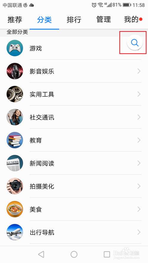 第二步进去应用市场之后,可以看到各种分类的应用,点击右上方的搜索图标,输入要搜索的游戏名称,如下图所示: