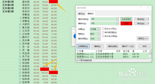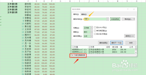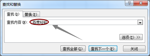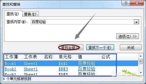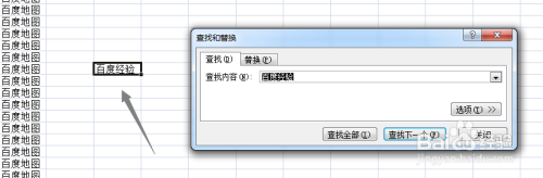 然后在该浮窗的查找内容里输入"百度经验",然后按一下键盘上的回车键,接着就会跳转到表格里的某一处百度经验关键词处,此处会有显示,如下图
