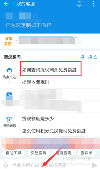 检索下图中方框所示内容,会弹出箭头所指问题,点击问题,即可进入提现额度查询界面,查询账户所剩额度。