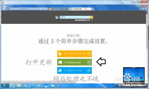 安装原装系统之后,IE浏览器是8版本的,很多网站可能会打不开,需要更新到11版本,升级成功之后,首次打开浏览器会弹出设置框。