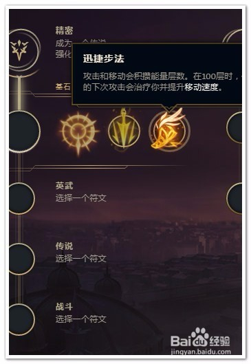 在三个基石里选择“迅捷步法”。治疗效果可以让初期对线弱势的亚索顺利渡过前期。
