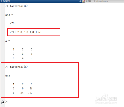 第二步factorial(a),如果a为一个矩阵的时候,会求矩阵每行每列的数据阶乘,如下图所示: