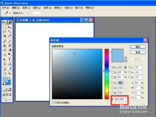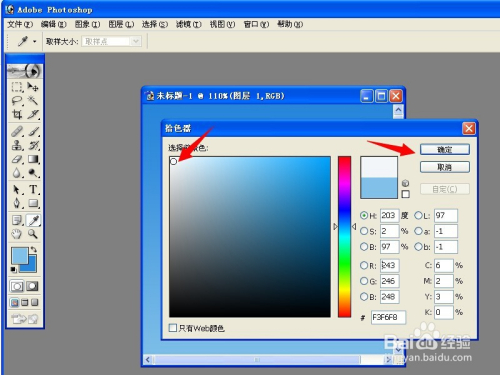这个时候,我们需要设置一下前景色,选择一个白色的颜色,这个颜色是我们所要画的云彩的颜色,具体白到什么程度就要看你自己的喜好了。