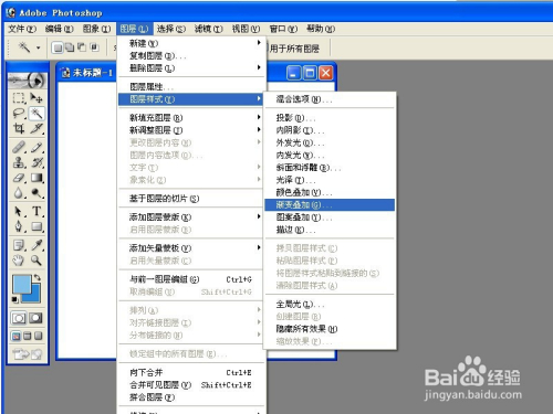 新建完毕之后,我们可以看到图层下面有很多的子菜单,这些都是ps可以处理的各种功能,今天我们想要增加上蓝天和白云只需要选择图层-图层样式-渐变叠加,这样就可以了。