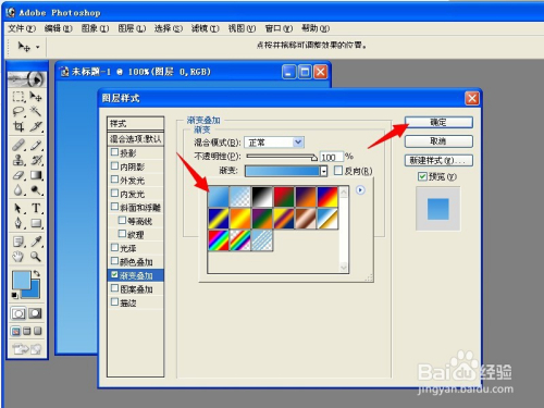 在渐变的图片选择上,我们选择那两个蓝色相互渐变的那个,然后点击确定。