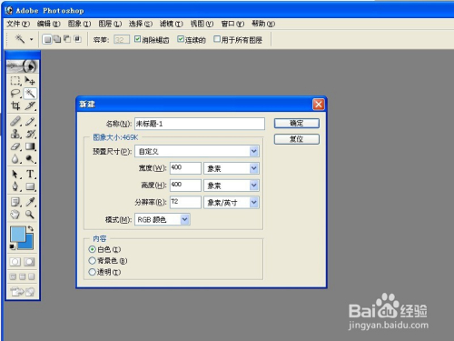 首先我们要做的当然是拥有ps这个软件了,我们需要将软件下载并且安装好,一切都完成之后就可以准备下面的工作了,我们进入PS主页之后,点击文件,并新建一个内容,我们设置成400*400像素即可,内容选择为白色。