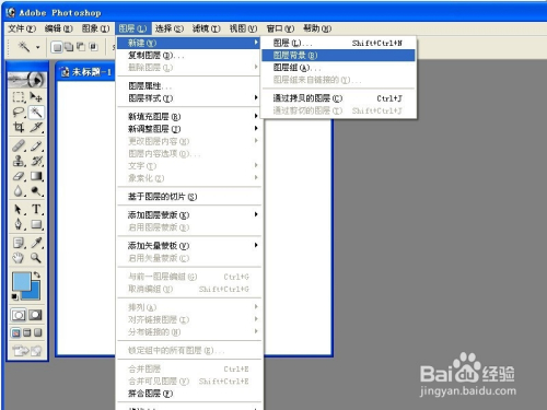 我们进入之后在最上面的菜单栏,看到第四个写着图层字样,点击进去,选择新建一个图层背景。