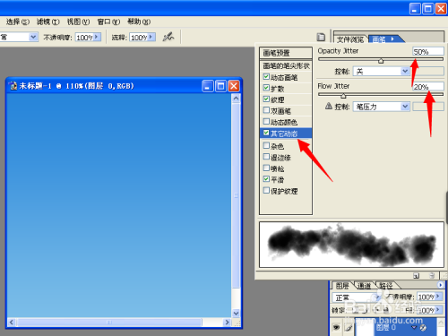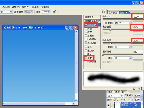 在动态画笔的选项中,我们设置抖动大小为100%,最小直径和抖动角度都是20%。