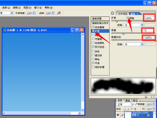 接下来,我们设置扩散,将两轴前面的对号勾上。后面设置为120%。下面的数量设置为5,数量抖动设置为100%。