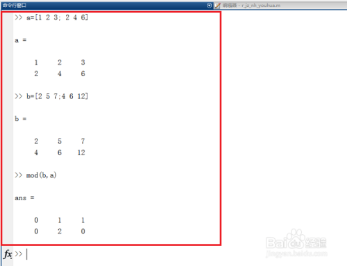 第三步mod(b,a),如果a和b为两个矩阵的时候,会得到b矩阵每行每列的数据除以a矩阵每行每列的数据求余数,如下图所示: