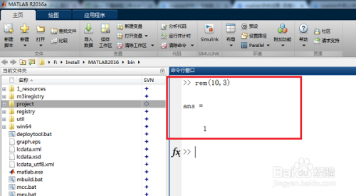 第一步通过mod()函数求余数,mod(m,n)代表求m/n的余数,打开matlab,在命令行窗口中输入“mod(10,3)”,按回车键,可以看到求余结果为1,如下图所示:
