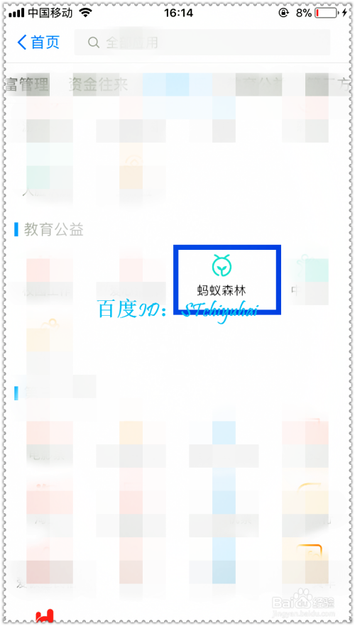 在应用管理界面,下拉列表,找到“教育公益”,在教育公益中可以看到有一个“蚂蚁森林”,就是这个植树公益活动。