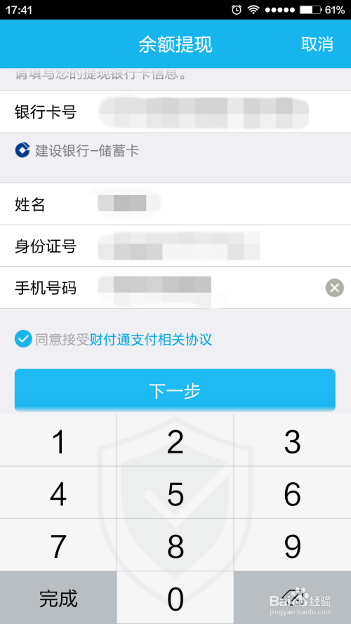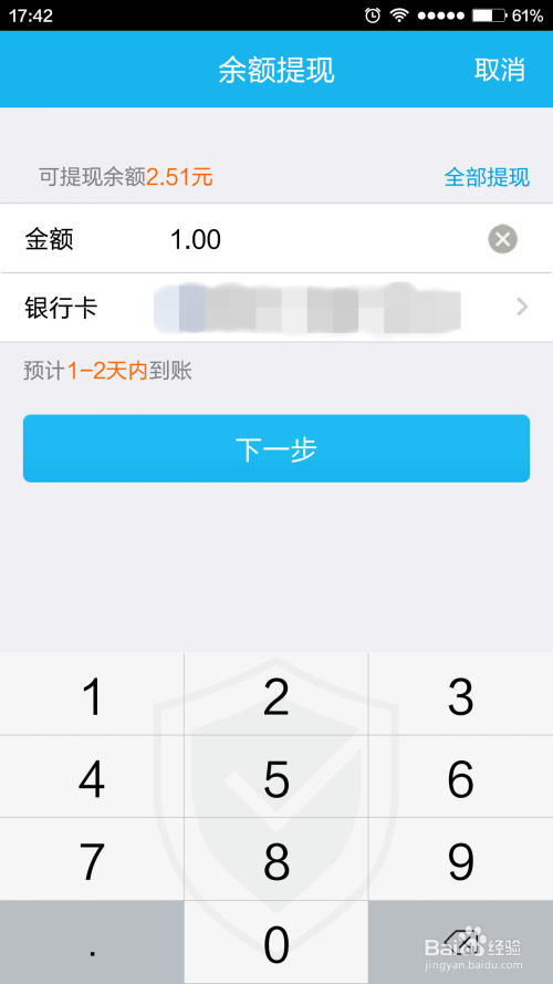 验证完毕之后,它还会再显示一遍你要提现的金额以及你的银行卡信息,然后点击下一步。