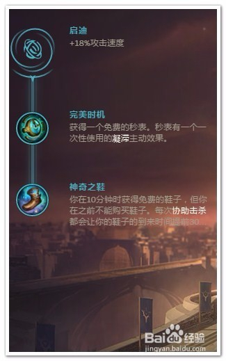 选择“启迪”作为“副系符文”(创造性的工具并扭转常规)。在副系符文1 里,选择“完美时机”。没什么多说的,一次救命机会,合复活甲必备物品;在副系符文2 里,选择“神奇之鞋”,卢锡安有E技能,前期并不是特别需要草鞋。