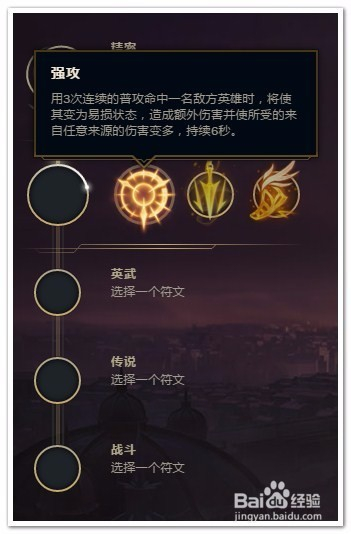 在三个基石里选择“强攻”。因为卢锡安的被动可以让他轻易打出三下普攻,可以为卢锡安后续打出大量伤害。