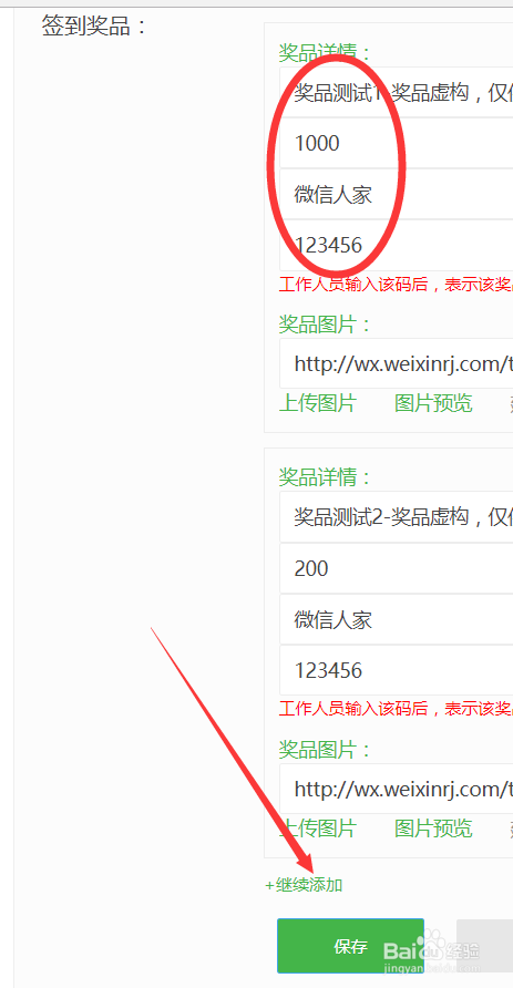 3,签到奖品设置,可以添加多个奖项,用于签到现场抽奖的,填写奖品详情;填写奖品名称、数量、赞助商和核销码,上传好奖品图片,最后保存即可。