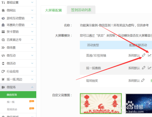 4,微信签到参与方式,回复关键词到公众号里参与,这个签到是现场版的,一次性的,不能每日累计的。可以现场点开大屏幕-普通/3D签到墙-大屏幕,查看现场签到人数和情况,可以自定义大屏幕背景图,按照尺寸。