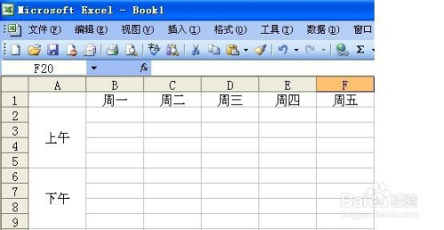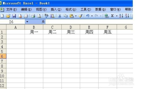 在第一行的“B”、“C”、“D”、“E”、“F”列,依次输入“周一”、“周二”、“周三”、“周四”、“周五”。