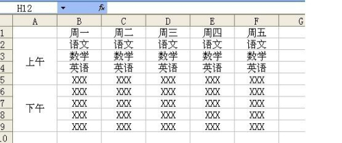 然后,在其它的40个单元格中,依次填入自己的课程,“语文”、“数学”、“英语”、“历史”、“生物”、“政治”、“地理”、“音乐”、“美术”等等。