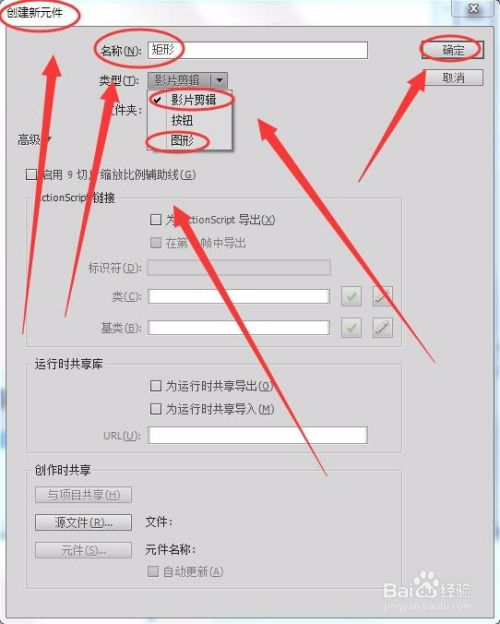 在“创建新元件”对话框中,“名称”本例中取名为“矩形”,“类型”选择“影片剪辑”(注:不要选择“图形”类型),单击“确定”。