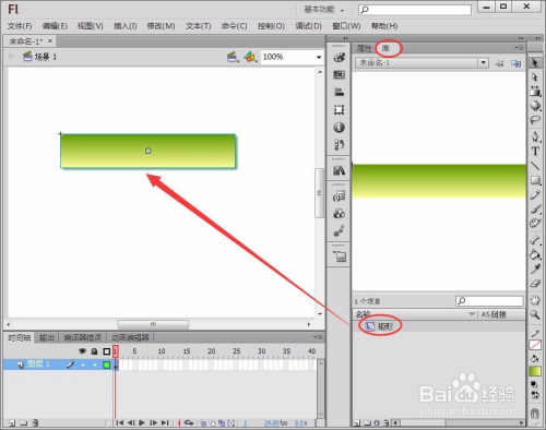 回到“场景1”,将“库”面板中的“矩形”元件拖动到舞台中。