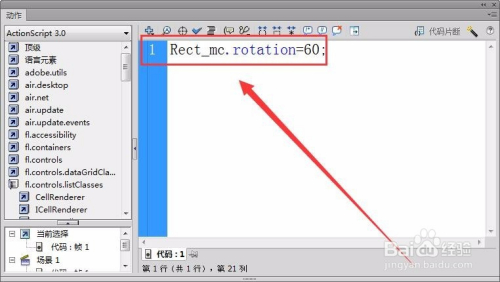 现在,要使矩形旋转60度,只需在“动作”面板中输入以下代码。