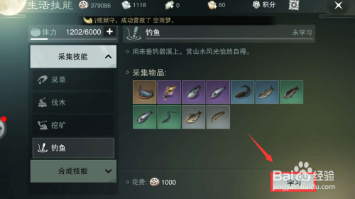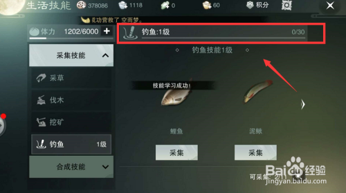 如图,这样就将钓鱼技能提升到1级了,1级的时候能钓鲤鱼和泥鳅,随着钓鱼等级提升,后面能钓是鱼会越来越多。