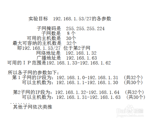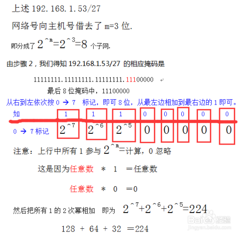 好了,我们已经算出192.168.1.53/27 ,每个网段最大容纳的主机数和可以主机数了,下面我们来计算子网掩码的10进制数是多少。