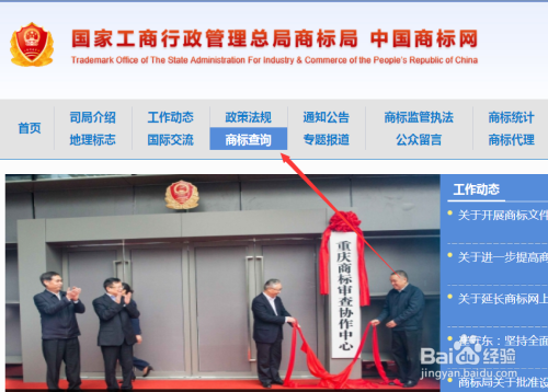 进入国家工商行政管理总局商标局官网后,直接点击导航上的【商标查询】,如下图所示。