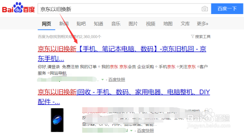 打开百度搜索京东以旧换新,然后点击搜索结果里的京东以旧换新官方网站,如下图所示。