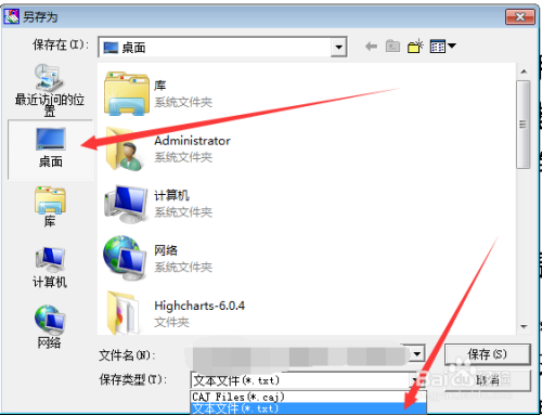 在”文件“菜单中选择”另存为“选项,在出现的界面中选择把文档保存为”.txt“格式,并保存到桌面,如图所示~
