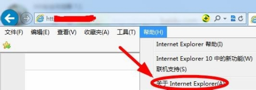 然后点击菜单栏里的"帮助",然后在下方弹出的小窗口里选择"关于Internet Explorer"
