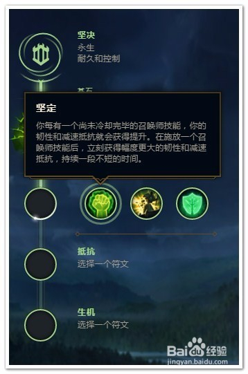 选择“坚决”作为“主系符文”(耐久和控制)。