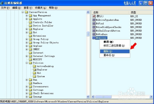 HKEY_CURRENT_USER\Software\Microsoft\Windows\CurrentVersion\Policies\Explorer分支。查看右边的窗口是否有DWORD的键值NOdrives,如有将其删除重启电脑。