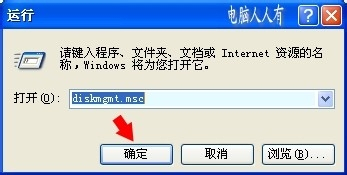 运行→输入:diskmgmt.msc之后点击确定(或按回车键)打开磁盘管理。