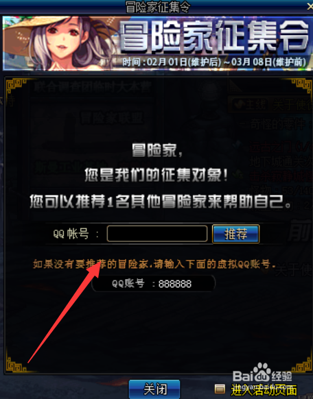 然后再点击里面的冒险征集令按钮,填上推荐人的游戏账号,也就是QQ号。