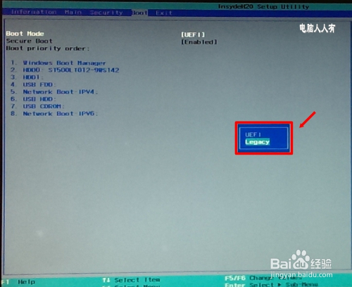 选中该项回车,打开设置项之后,这里有两个选项:UEFI 和Legacy(使用上下键选中),引导模式选择Legacy。