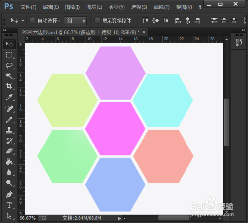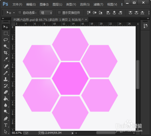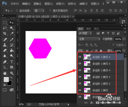 把第一个六边形绘画好之后,用鼠标选中正六边形的图层,使用键盘上的【快捷键:CTRL+J】再复制出6个相同的六边形的图形。