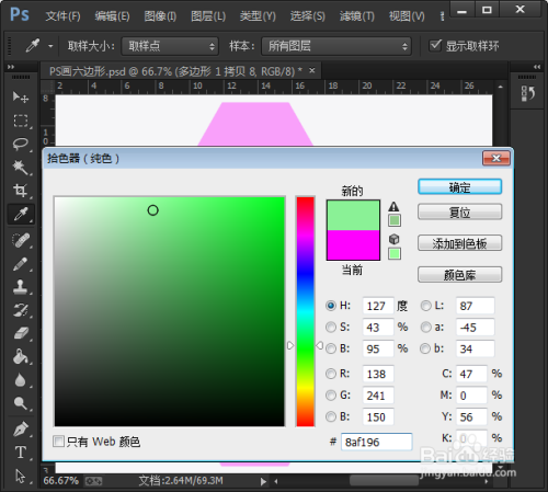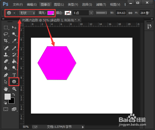 单击绘图工具选择【多边形工具】,在填充颜色里面选择一个自己喜欢的,然在在白色的画布的任意空白处绘画【一个正六边形的形状】如图所示;