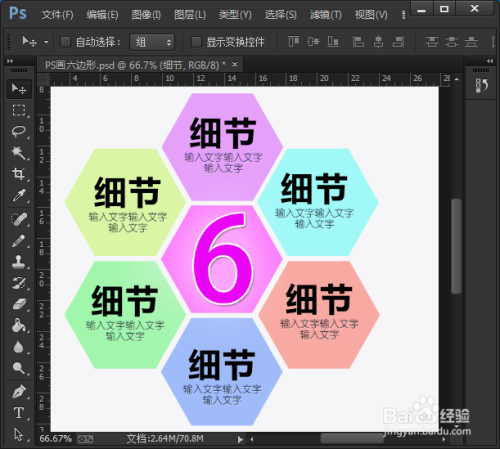 最后,在每个六边形的上面输入细节文字和相关内容即可。字体颜色也可以改成自己喜欢的效果。