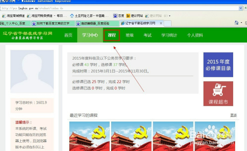 打开辽宁省公务员在线学习网,进行有效登录,登录成功后,我们看到如下界面。希望大家不要忘记密码。